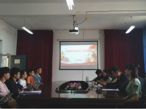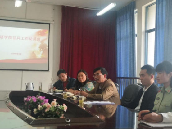 为响应国家号召,鼓励高等学校毕业生积极应征入伍服役,提高兵员征集质量,推进国防和军队现代化建设,外国语学院于2019年4月18日下午3点在外国语学院会议室召开“征兵工作动员会”。此次参会人员有:外国语学院党总支书记陈永、校武装专职武装干事阮杰、学生科科长廖艳、辅导员崔旭、14级退役返校学生代表陈翠、16级英语专科和15级英语本全体男生参加,本次会议由学生科长廖艳主持。