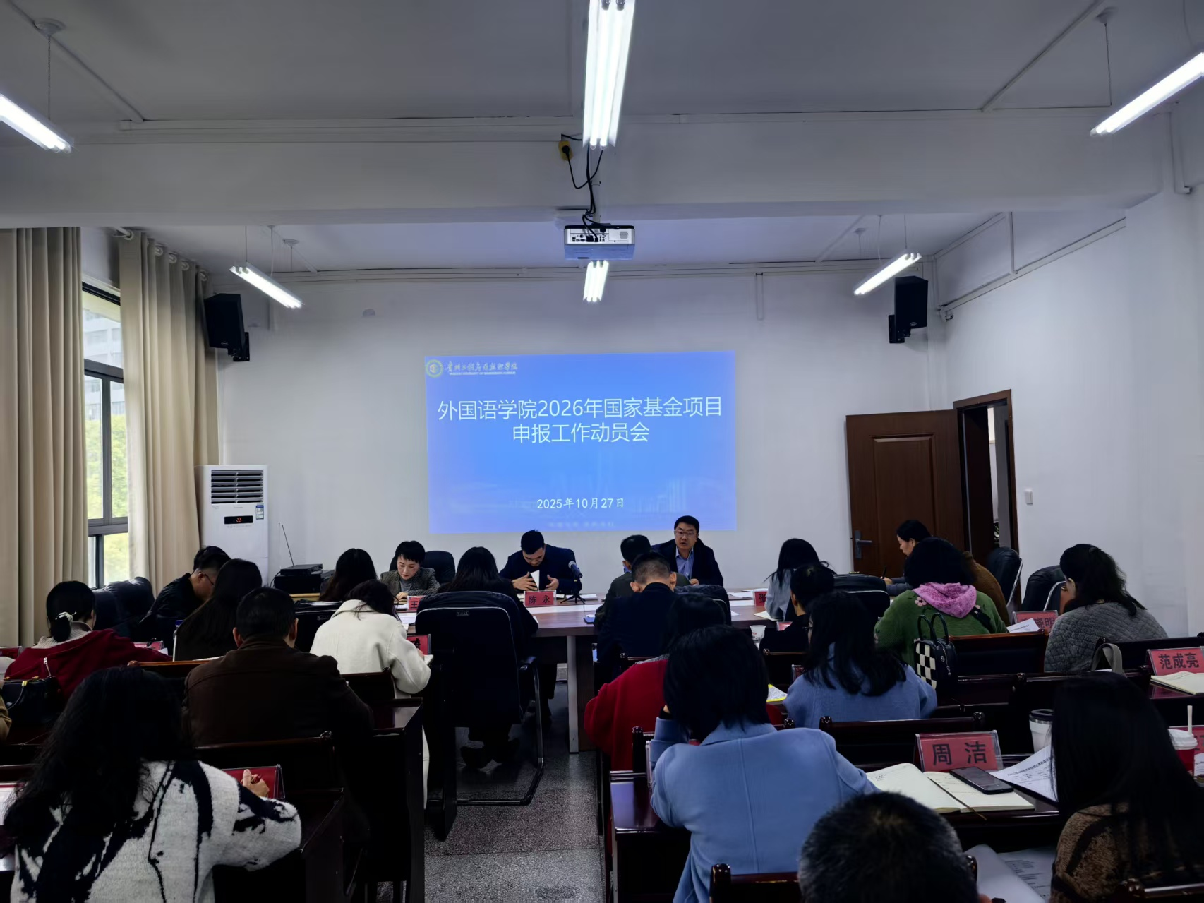 为落实落细学校2026年国家基金项目申报工作会议精神和要求,科学谋划、全面启动外国语学院2026年度国家基金项目申报工作,外国语学院于10月27日下午召开了2026年国家基金项目申报工作动员会。会议由院长胡荣华主持,学院领导班子、科研团队负责人及中青年教师共计50余人参加会议。此次会议的召开,标志着学院新一年度的国家基金项目申报工作正式拉开帷幕。