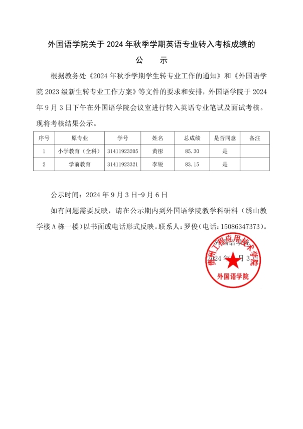 外国语学院2024年秋季学期转专业结果公示