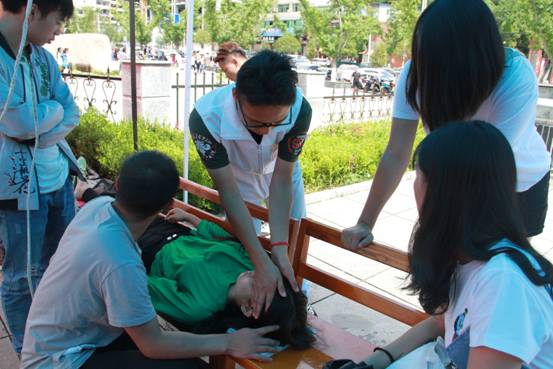 志愿者正在给一位由于天气炎热晕倒的新生做按摩
