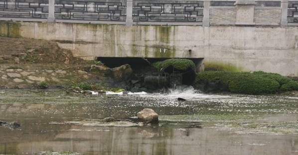 (由于河水NH4+的含量严重超标,河水发出如同厕所般的臭味,图为成员检查排污口是否废弃)