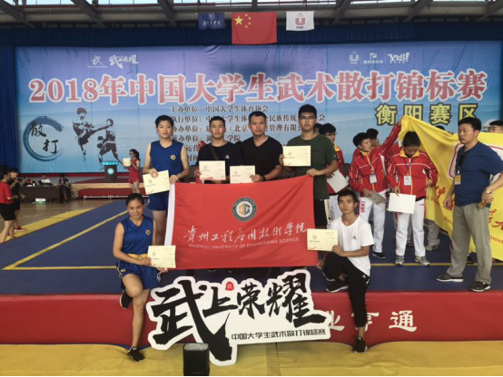 2018年中国大学生武术散打锦标赛(衡阳赛区)于7月21日至26日在湖南工学院举行,我校散打队由体育学院副院长曹体望担任领队,张双建老师担任教练员,共派出四名运动员参赛。在此大赛中我校共获得1金、1银、2铜的好成绩,其中16级美术本科班学子刘东明荣获男子85公斤级甲组冠军,17级小教本科班王梓楠荣获女子65公斤级甲组亚军,15级车辆本科班的丁胜峰荣获男子48公斤级甲组第三名,15级人力资源管理本科班的吕厚荣荣获女子甲组48公斤级第三名。同时,张双建老师被评为优秀教练员,贵工程散打队被评为优秀运动队,我校参赛的四名运动员取得了2018年中国大学生武术散打冠军赛的资格。