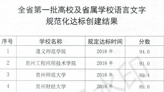 近日,贵州省语言文字工作委员会、省教育厅下发了《关于公布第一批高校及省属学校语言文字规范化达标创建结果的通知》(黔语发〔2019〕4号),我校获贵州省首批高校及省属学校语言文字规范化达标创建第二名,为我校再添一项省级荣誉。