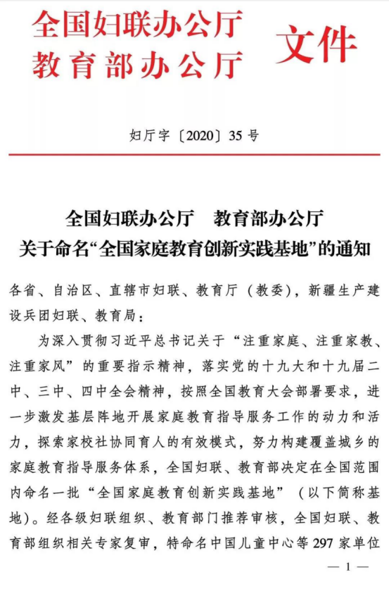 据悉,此次全国范围内命名的“全国家庭教育创新实践基地”共297个,其中贵州省10家,有效期为5年(2020—2024年)。该项评选旨在进一步激发基层阵地开展家庭教育指导服务工作的动力和活力,探索家校社协同育人的有效模式,努力构建覆盖城乡的家庭教育指导服务体系。