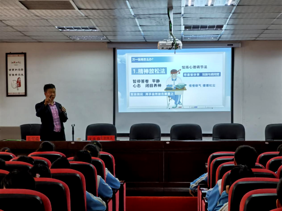 沈承春副教授围绕“怎样调整心态,轻松备考?”展开,通过考前放松方法和考中调节策略,讲述了调息放松、纵情想象放松、宣泄放松三种方法,并通过考前应做的十件事和考中应试答题策略及如何克服怯场等方面做了心理辅导。辅导现场有放松训练、游戏互动,气氛十分活跃,本次辅导对学生在心理调节、积极应对考试等方面有很好的指导作用。沈承春副教授最后希望大家常态化应对中考并对大家致以美好的祝愿。