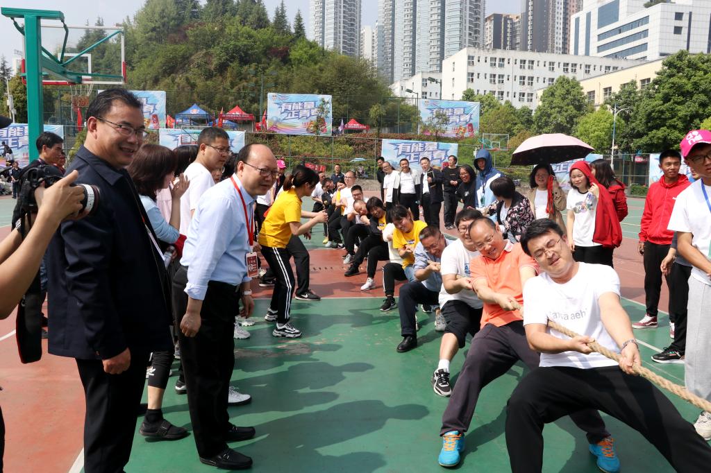 绣山篮球场上,一片热闹非凡的景象,加油声、呐喊声不断。大家本着“友谊第一,比赛第二”的心态踊跃参与了“双手抛实心球”“8字跳绳”“乒乓球往返接力”“赶球往返接力”和“男女混合拔河比赛”等趣味活动。各学院教职工代表扎好马步,稳定下盘,排好步伐,眼神坚定,握紧主绳,倾尽全力与对手顽强拼搏,用自己独有的表情诠释着一个共同的词语--团结,他们表现出的坚强、勇敢、团结协作精神深深地感染了在场的每个人。学校党委书记令狐荣锋、校长王建平、副校长李琳也加入到广大教职工中,成为了啦啦队的主力,党委副书记向贤礼、副校长杨友昌更是换上装备加入到了拔河队伍中,赛上他们是对手,赛下他们是家人,大家彼此鼓励,相互照顾,营造了一个温情满满的贵工程大家庭氛围。