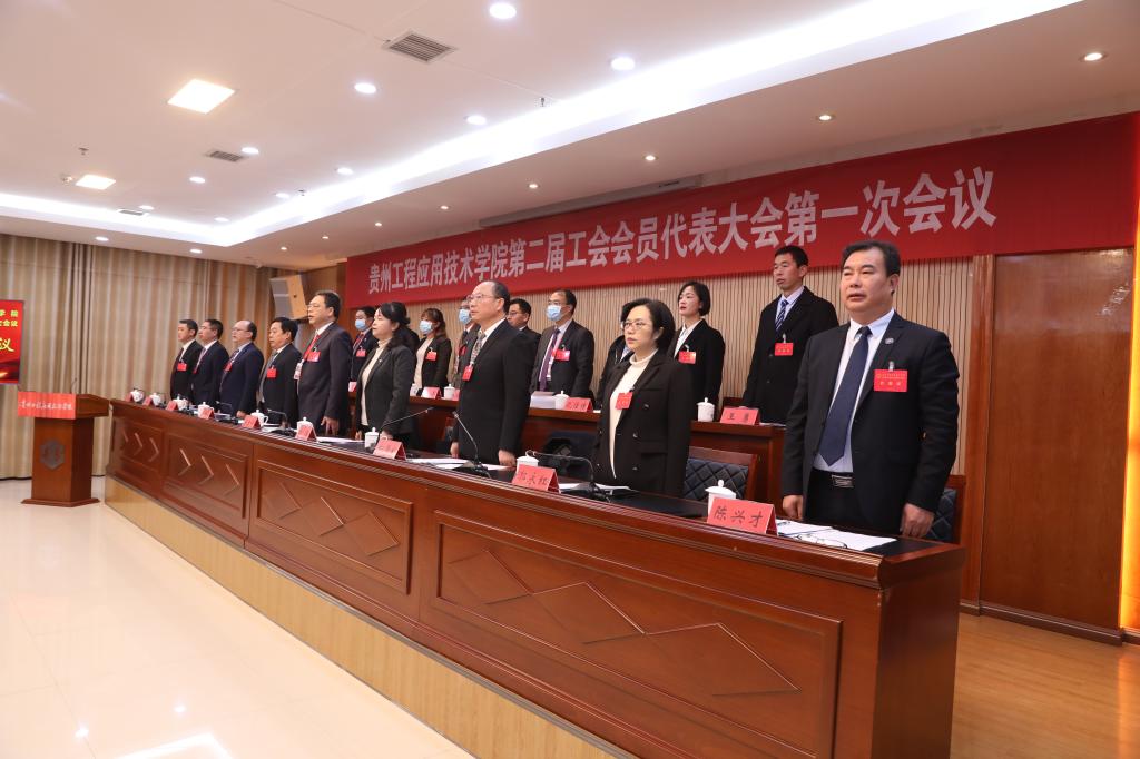 伴随着雄壮的国歌声,贵州工程应用技术学院第二届工会会员代表大会拉开序幕。汤宇华致开幕辞;彭菊讲话;王明华作《第一届工会委员会工作报告》、《工会经费使用情况报告》(书面);陈兴才作《关于第二届工会委员会委员和经费审查委员会委员候选人名单、经费审查委员会主任人选建议名单的说明》。