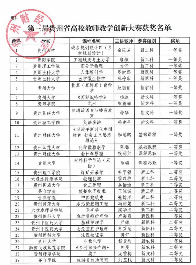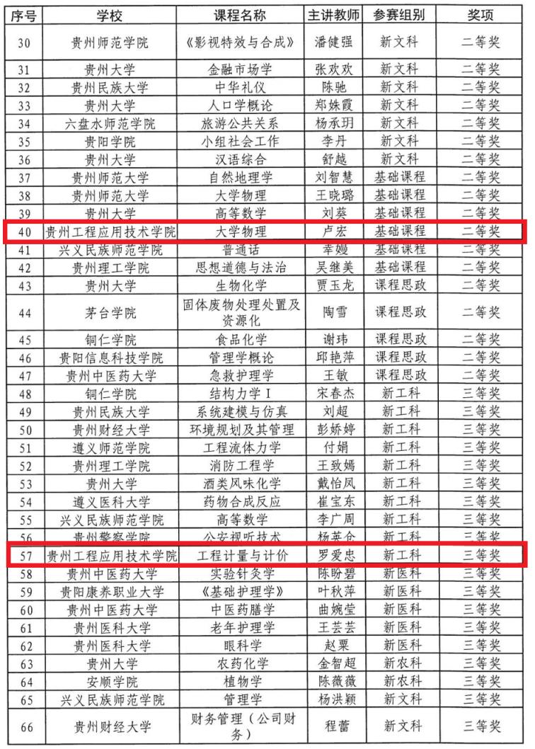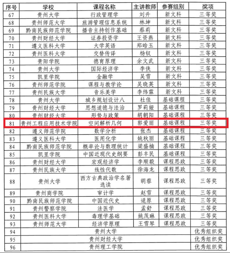 根据《省教育厅办公室关于举办第三届贵州省高校教师教学创新大学的通知》文件精神,落实立德树人根本任务,助力高校课程思政建设和新工科、新医科、新农科、新文科建设,推动信息技术与高等教育教学融合创新发展,落实引导高校教师潜心教书育人,打造高校教学改革的新风向标,贵州省教育厅委托贵州财经大学承办第三届贵州省高校教师教学创新大赛。经承办单位组织专家评审,贵州工程应用技术学院理学院卢宏获基础课组二等奖,郭爱丽获基础课组三等奖,土建学院罗爱忠获新工科组三等奖。