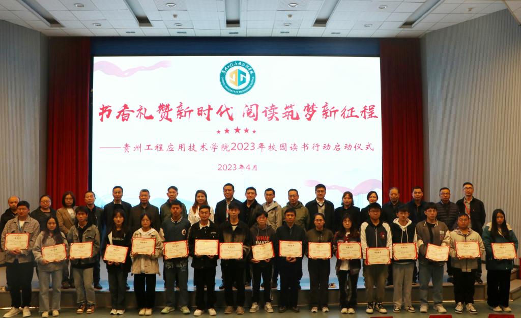 主持人公布相关活动获奖同学名单,参会领导为他们颁奖并合影留念。颁奖完毕,主持人呼吁大家积极参与“贵州工程应用技术学院2023年读书行动”。
