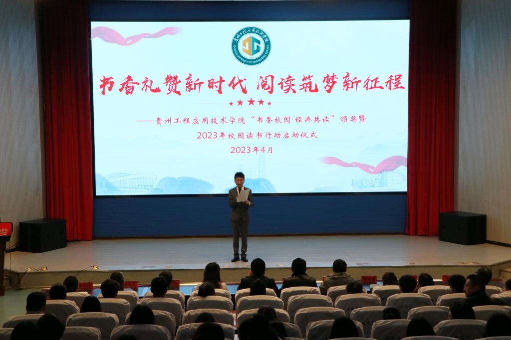 生活因阅读而多姿,生命因阅读而精彩。为引导激励我校广大教职工爱读书、读好书、善读书,强化培根铸魂、启智润心,切实增强历史自觉和文化自信,深入推进“书香校园”建设。4月24日下午,我校在身修礼堂举行贵工程“书香校园·经典共读”活动颁奖暨2023年校园读书行动启动仪式。学校党委委员、副校长赵军,党委委员、宣传部(统战部)部长夏鲲,北京世纪超星信息技术发展有限责任公司副总裁海洋,北京世纪超星信息技术发展有限责任公司贵州区负责人周凯出席会议。相关职能部门和各教学院领导,学校部分学生参加会议。