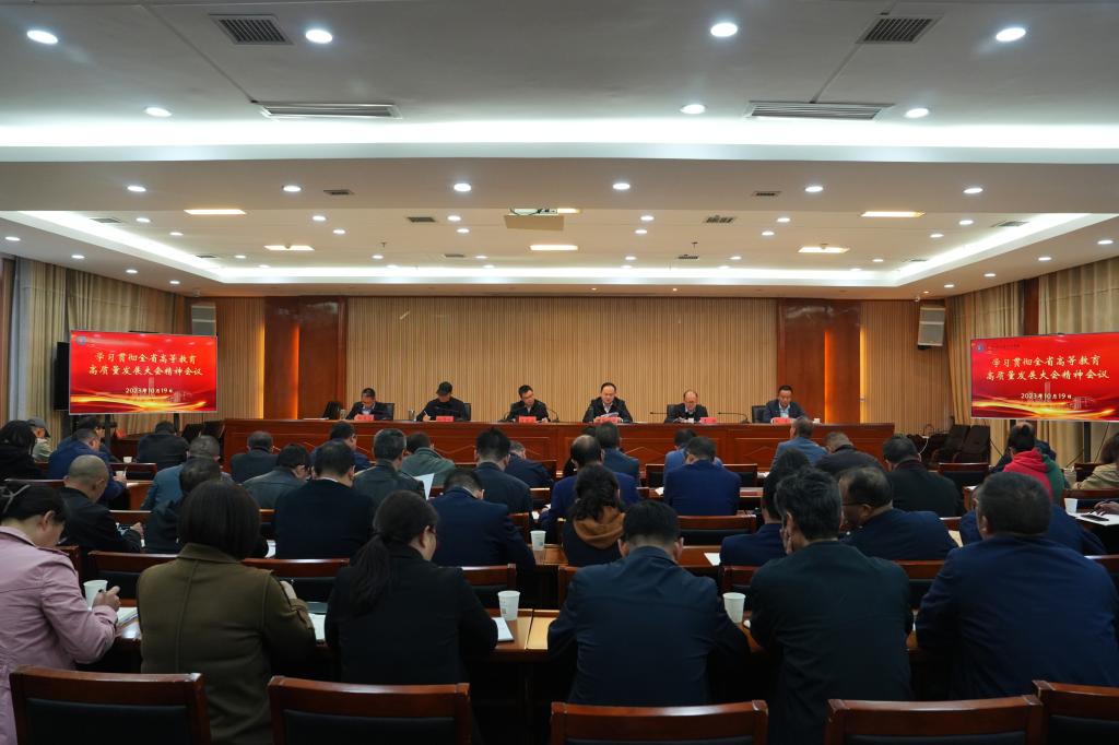 为深入学习贯彻习近平总书记关于建设教育强国的重要论述和视察贵州重要讲话精神,全面贯彻党的教育方针,坚持把立德树人作为根本任务,深入推进高校布局调整,奋力推动贵州高等教育迈上新台阶,为推进中国式现代化的贵州实践提供有力支撑,10月18日,全省高等教育高质量发展大会在贵阳召开。为及时传达学习大会精神,10月19日下午,我校在西区综合楼1202会议室召开学习贯彻全省高等教育高质量发展大会精神会议。校党委书记肖建宗,校党委副书记、校长张嗣杰,校党委副书记向贤礼,党委委员、副校长李琳、杨友昌、赵军出席会议,全体处级干部参加会议。会议由肖建宗主持。
