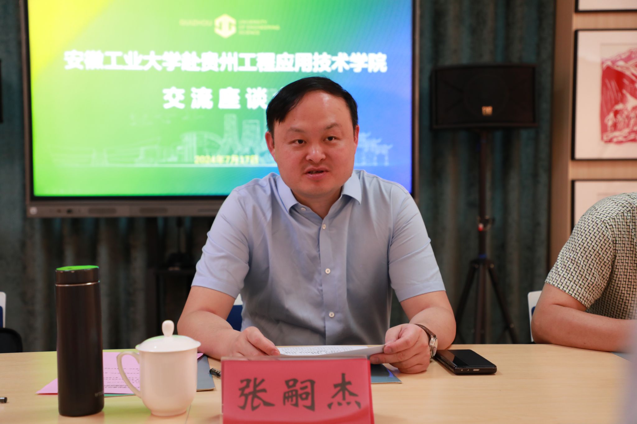 为加强两校沟通和联系,搭建高校间友好交流的桥梁,促进高校共同进步,7月17日下午,安徽工业大学党委副书记、校长魏先文,副校长郑啸一行赴我校交流座谈。座谈会在红展馆会议室召开,我校党委副书记、校长张嗣杰出席并主持会议。