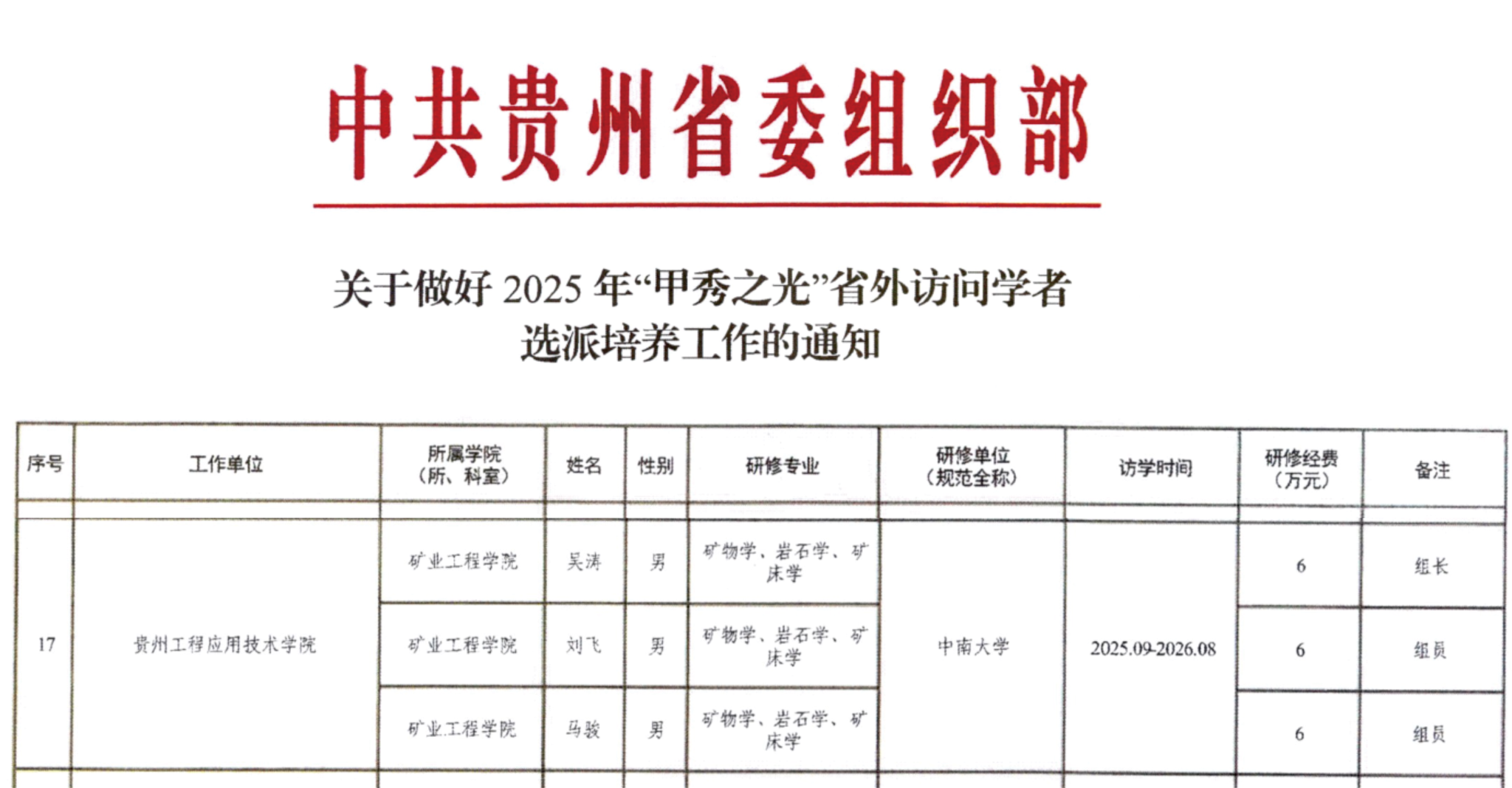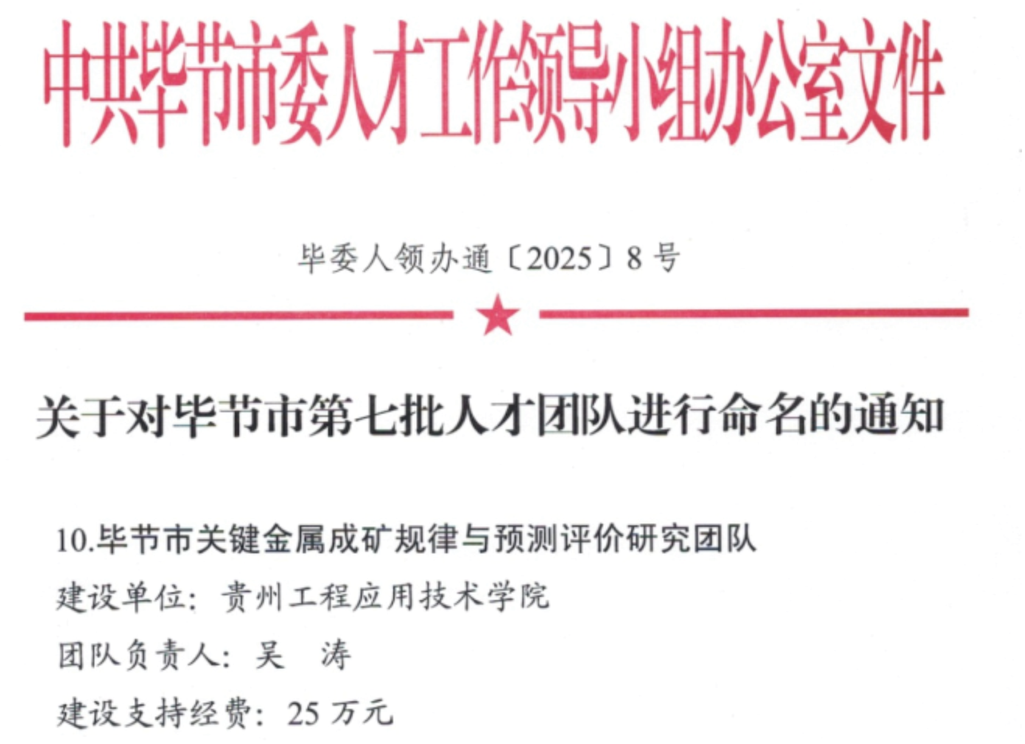 市级人才团队的成功立项与三名骨干成员同期入选省级人才项目,标志着我校在关键矿产研究领域的团队建设与人才培养取得了阶段性重要突破,形成了“团队带动人才,人才支撑团队”的良性发展格局。这不仅为团队后续科研工作的深入开展奠定了坚实基础,也为贵州省“富矿精开”战略的实施和学校学科建设与科研实力的提升注入了新的强劲动力。