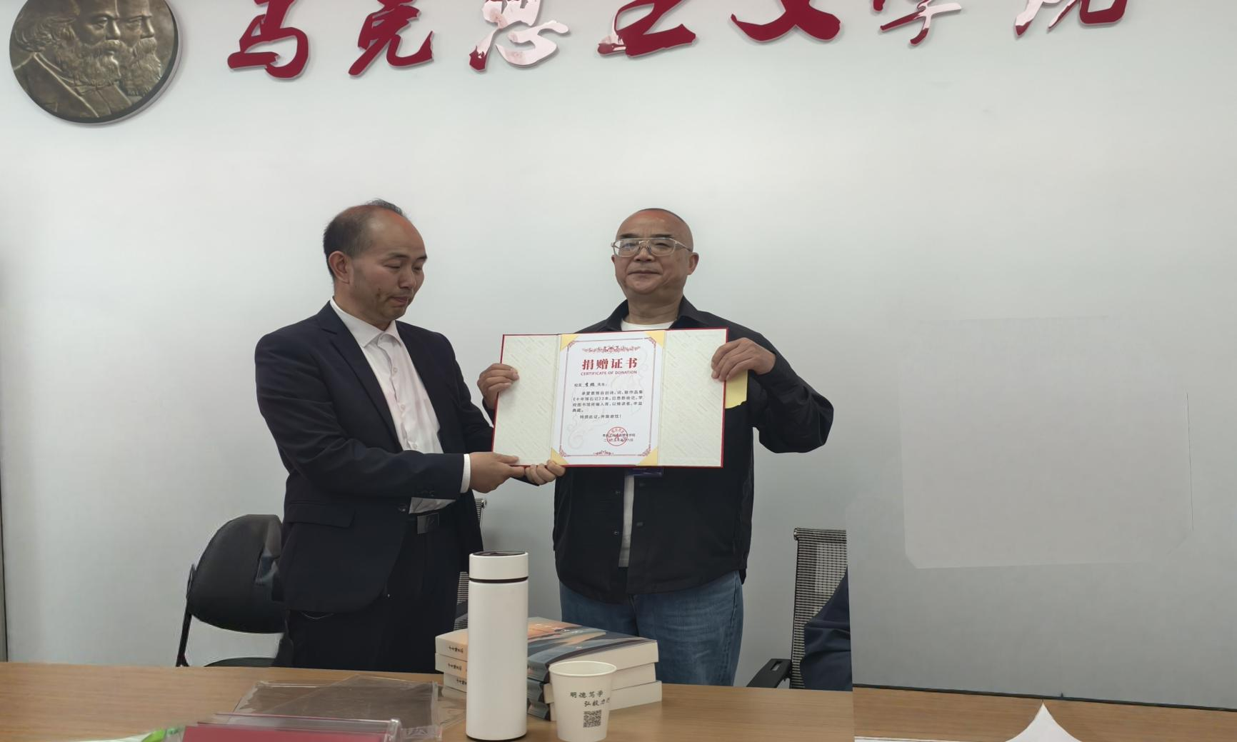 马克思主义学院党总支书记漆国江向校友李鹏颁发捐赠荣誉证书