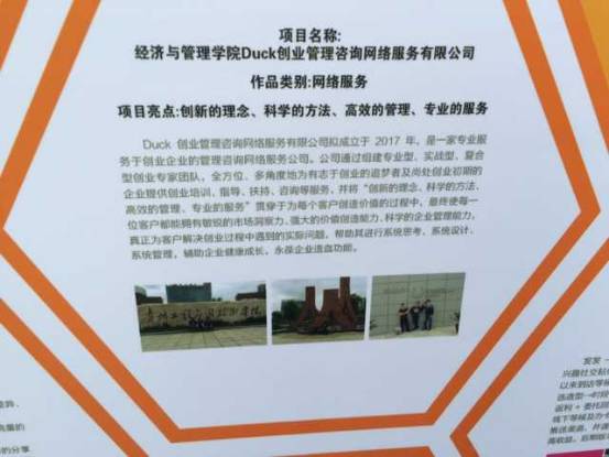 经济与管理学院“Duck创业管理咨询网络服务有限公司”在中国青少年互联网创业大赛项目中克服经验欠缺、创业资金较少等困难,与来自北京、浙江、上海、马来西亚、新加坡大学等省市和国家优秀团队同台竞技,喜获佳绩。
