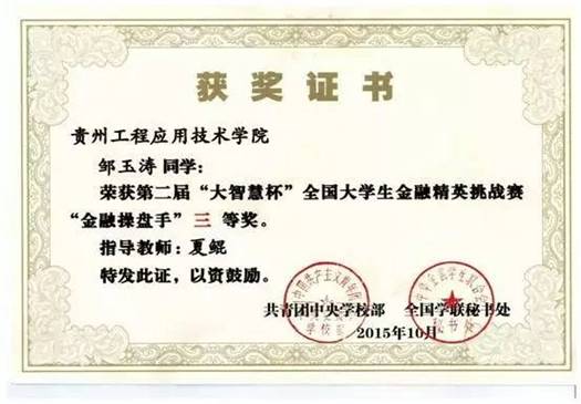 经管学子刘建、邹玉涛同学在第二届“大智慧杯”全国大学生金融精英挑战赛中分别获得“金融操盘手”三等奖。
