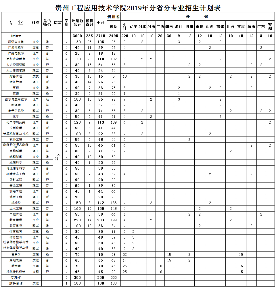 贵州工程应用技术学院2019年分省分专业招生计划表